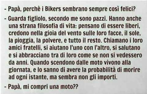 In modo che si potrebbe definire "estremo", ma il papà, inconsapevolmente, dipinge uno stile di vita che ad un ragazzino non può che piacere. Un po' macabra la frase dove si dice di vivere alla giornata prchè si potrebbe morire, ma questo potrbbe succedere pur non assendo "motociclisti".