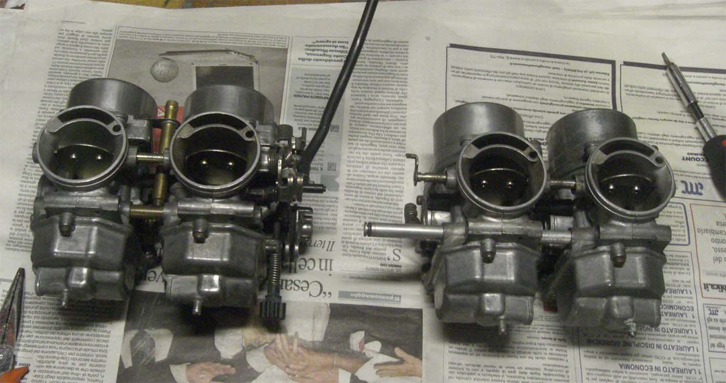 Ho separato i carburatori di una batteria che ho di riserva circa un anno fa. Ho tenuto le foto nel cassetto soprattutto per pigrizia. Le posto ora con qualche commento.