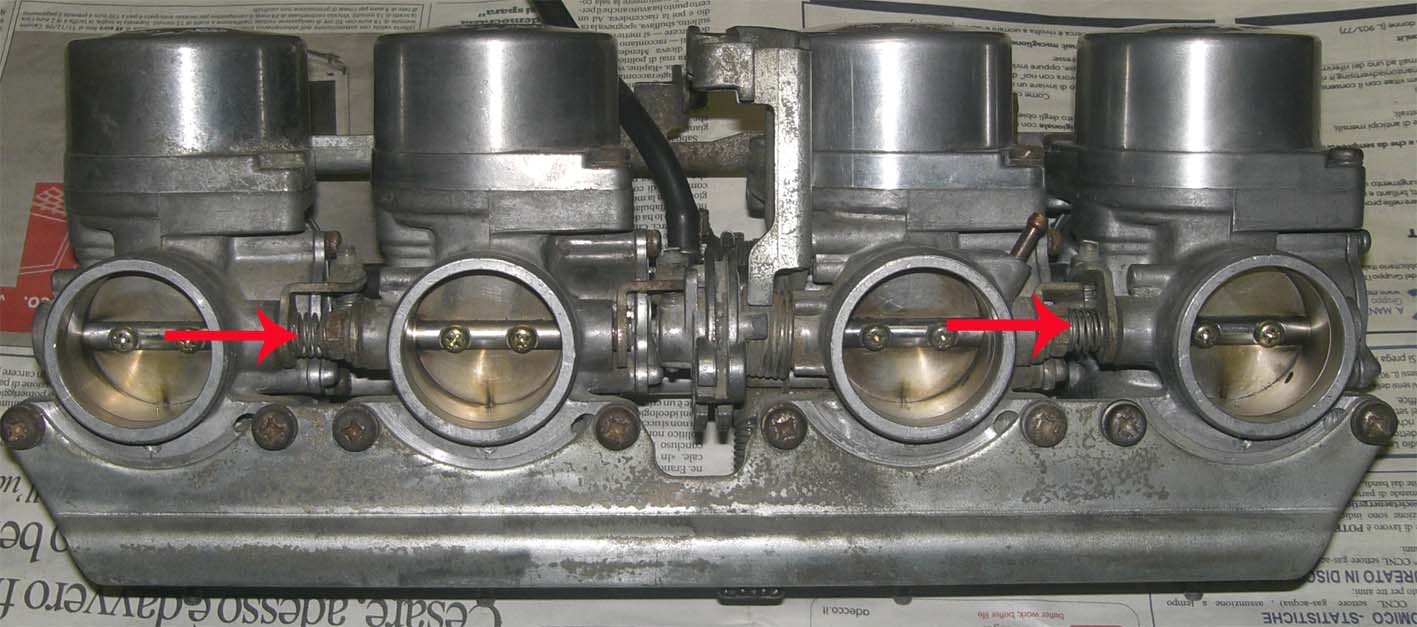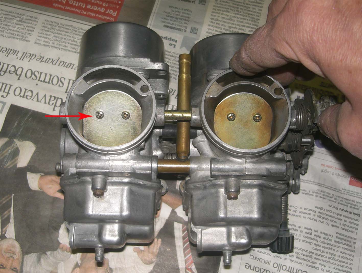 Foto 6. è necessario svitare le viti che fissano le farfalle dell’aria (parte posteriore dei carburatori). Il manuale suggerisce di segare le estremità delle viti. Io le ho svitate molto adagio e sono poi riuscito a rimetterle.