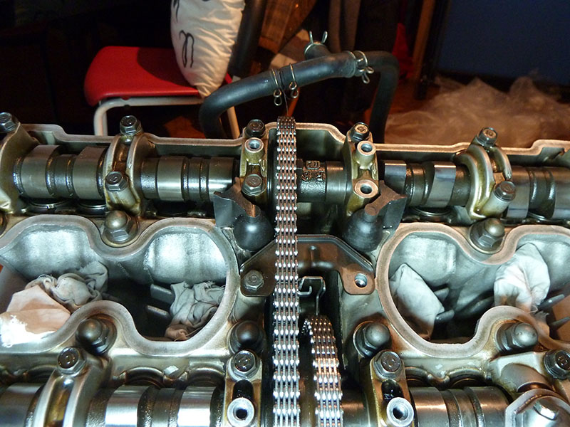 Dopo aver messo i bicchierini e le pastiglie che si vedono sull'aspirazione (vanno numerati e ognuno va rimesso nel suo posto di origine) ho montato e messo in fase l'albero a camme di scarico e la sua catena. Quella che pende è la catena corta. Qui ho incontrato qualche difficoltà perchè lo infilavo dalla parte sinistra invece che da destra, guardando il motore da dietro, e non riuscivo a metterlo nella posizione corretta. In questa fase la catena lunga mi è caduta più volte nel carter ma l'ho recuperata facilmente con una calamita telescopica.