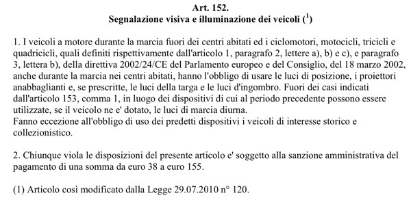 L'art. 152 del Cds è stato modificato dalla legge 120 del 29 Luglio 2010, esentando dall'obbligo i veicoli di interesse storico e collezionistico: