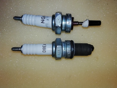 La prima cosa che ho controllato sono state le candele; e qui sono iniziate le prime difficoltà. La candela 1 e 4 sono venute via senza grossi problemi, ma la 2 e la 3 praticamente incollate alla testa. La 2 purtroppo dopo aver messo Svitol e forse tirato troppo si è spezzata ( vedi foto ).