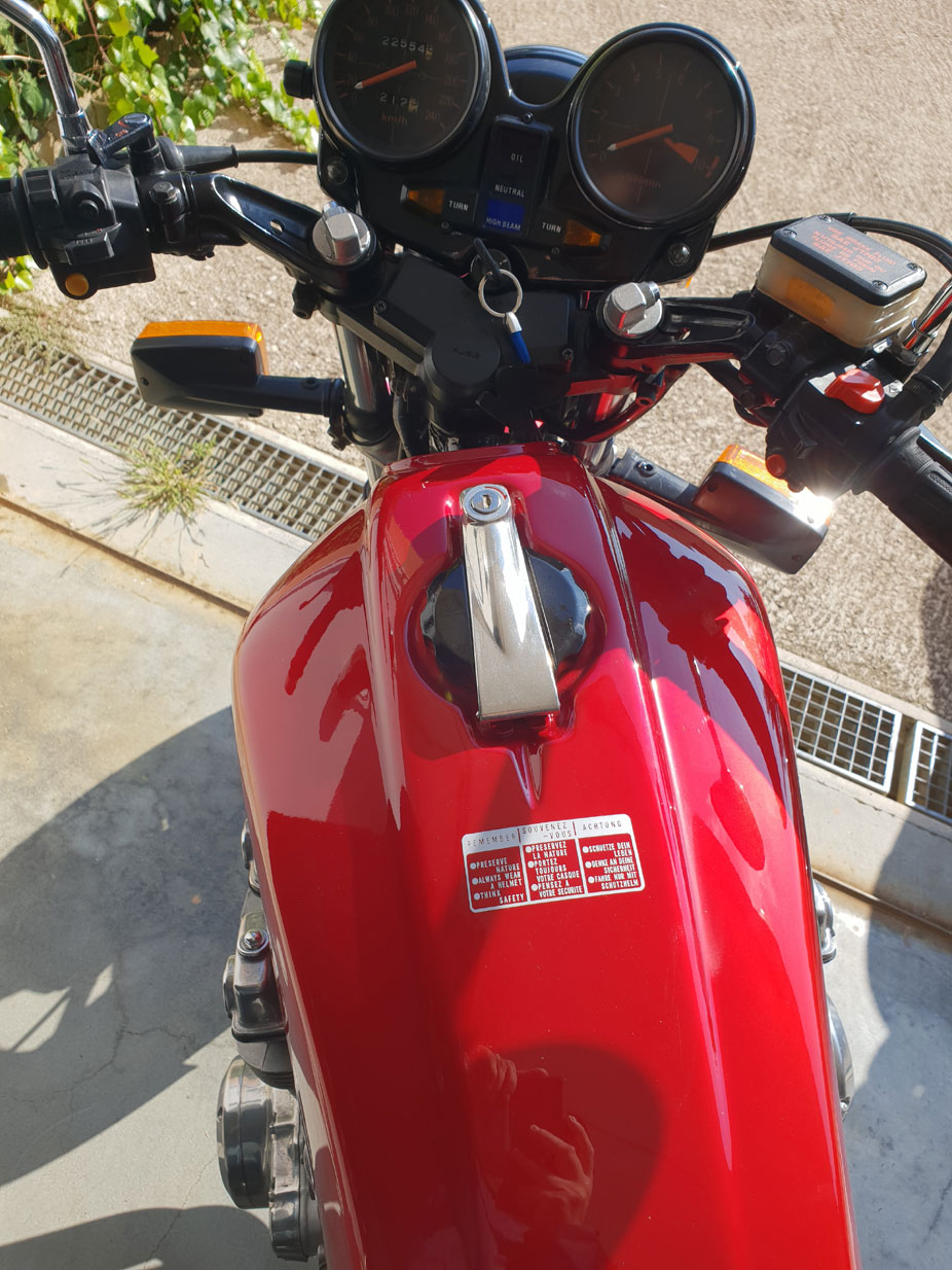 Restauro appena finito. Motore con pochi km ( 32500). Catene e tendicatene distribuzione nuovi . Carburatori revisionati. Impianto frenante completamente rifatto . Scarichi nuovi Marving. Riverniciata con suo colore Candy bourgogne red r107 . Gomme all'80 % . 2 Selle una delle quali ( non in foto ) ribassata .