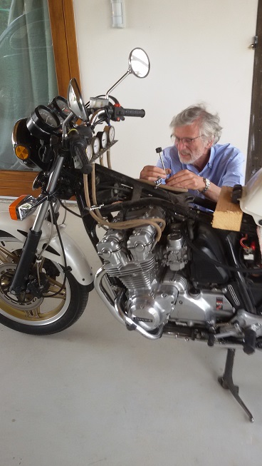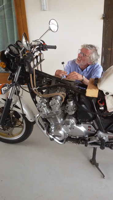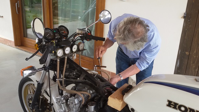 Ed ecco il nostro Antonino all'opera......con fare da chirurgo ha allineato i carburatori della 750.......erano abbastanza fuori fase........