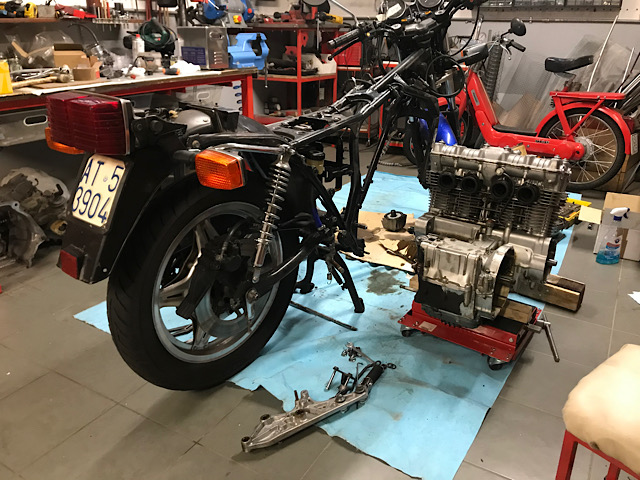 Ieri ho avuto pochissimo tempo e mi sono limitato a ripulire l'area attorno allo scheletro della moto mettendo i pezzi smontati in vari scatoloni e riponendo gli attrezzi al loro posto. E' una parte noiosa ma almeno poi trovo quello che mi serve.