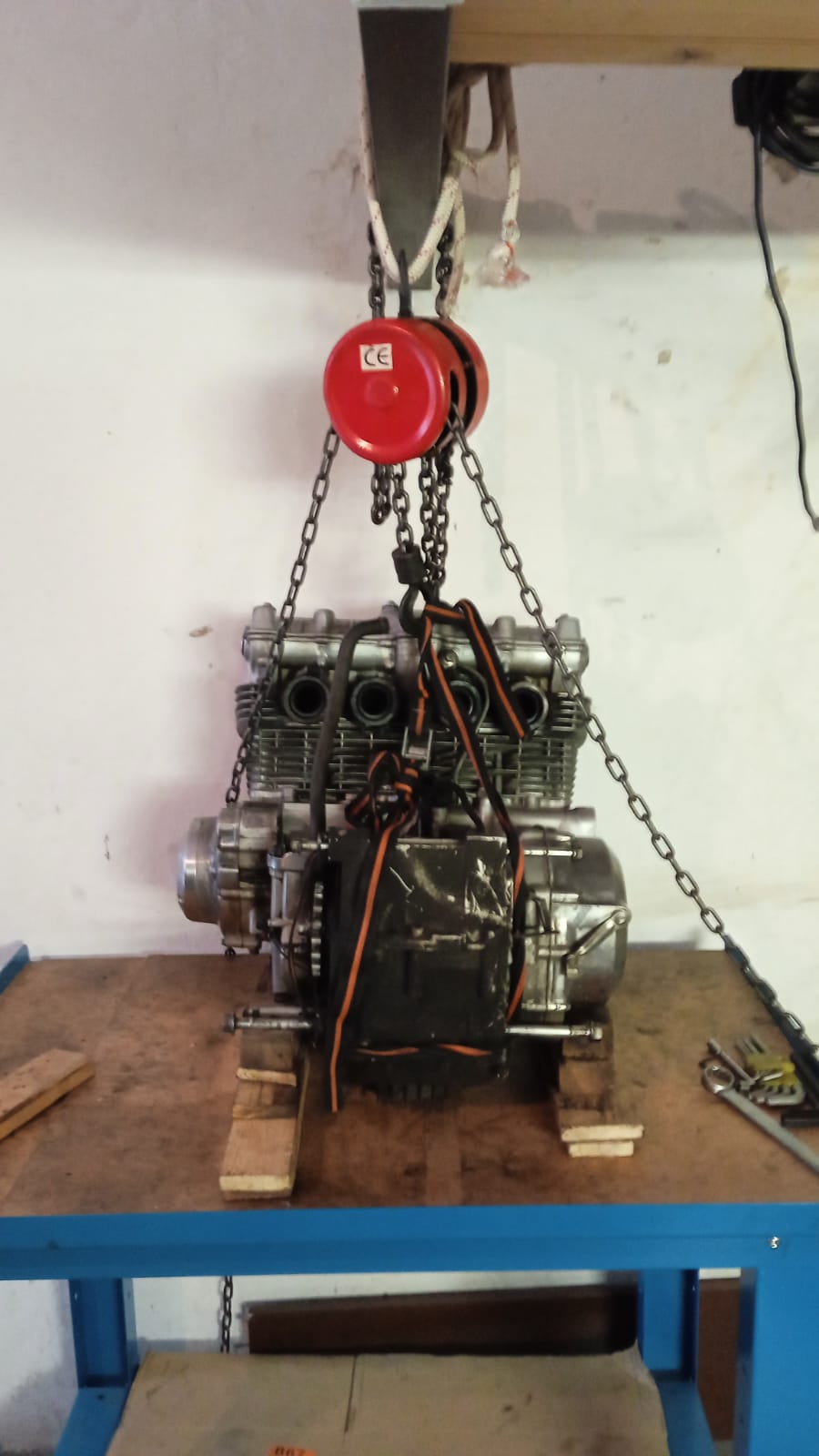 Ho anche io un paranco a soffitto ( mi è servito per sostituire il motore del Samurai un paio di volte) ma è in posizione fissa e non dove lavoro sulla moto. Comunque ho creato un telaio in legno dove appoggiare saldamente il motore e, con l'aiuto di mio figlio, lo abbiamo piazzato.