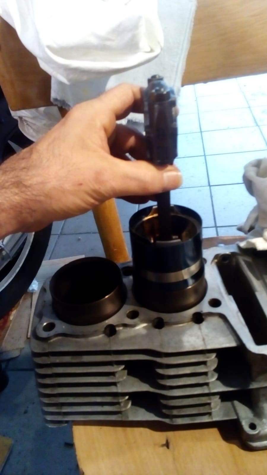 Io ho solo una camicia per inserire i pistoni e quindi mi trovo bene a inserire una alla volta le bielle nei loro pistoni, un pistone alla volta nel suo cilindro e infine, due bielle alla volta, sull'albero motore facendo scorrere verso l'alto il blocco cilindri. In entrambi gli step fermo il blocco cilindri inserendo in uno dei prigionieri un tubo in pvc segato alla misura giusta e bloccato in basso dal dado del pignone. Calandoli dall'alto non saprei come fermare l'albero motore e nemmeno come stringere le bielle perché il piano d'appoggio me lo impedirebbe. Infine per inserire i cilindri a carter chiuso (come da manuale e img allegata) servirebbero dei distanziatori e ben due camicie del pistone da togliere agendo in uno spazio troppo ristretto.