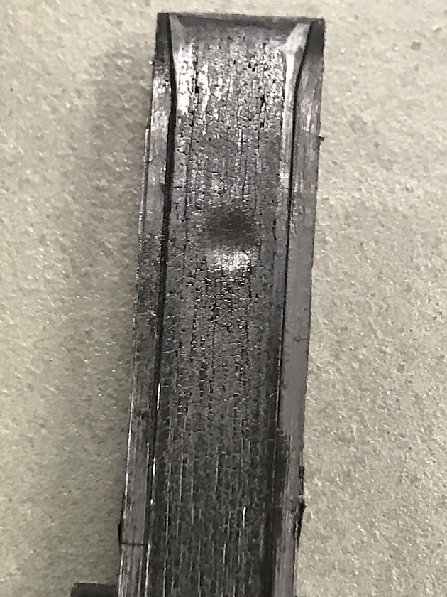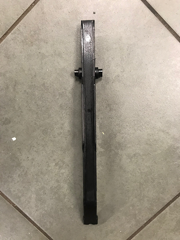 Non sembra molto consumata ma uno dei due perni dì appoggio è rovinato. Sembra essere un pezzo costano sto: plastica iniettata su un’anima Metallica. Forse un termoindurente.