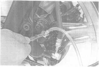 Individuare la valvola di spurgo sulla pinza del freno, levare il cappuccio di protezione, inserire sul dado una chiave poligonale (da 8 nei Bol d’or) e infilare sullo sfiato un tubo di gomma, meglio se di vipla trasparente, di dimensioni opportune (4-5 mm di diametro).