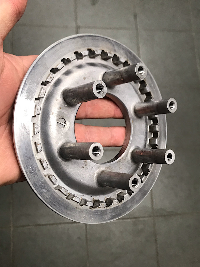La frizione però non staccava. Pensavo si fossero incollati i dischi ormai asciutti (lo so, avrei dovuto smontarli subito e rimetterli a bagno...). Quindi ho scolato l’olio, riaperto i carter e sfilato i dischi. Per curiosità ho tolto anche il piattello incriminato, per verificare i filetti, e ho trovato la sorpresina.