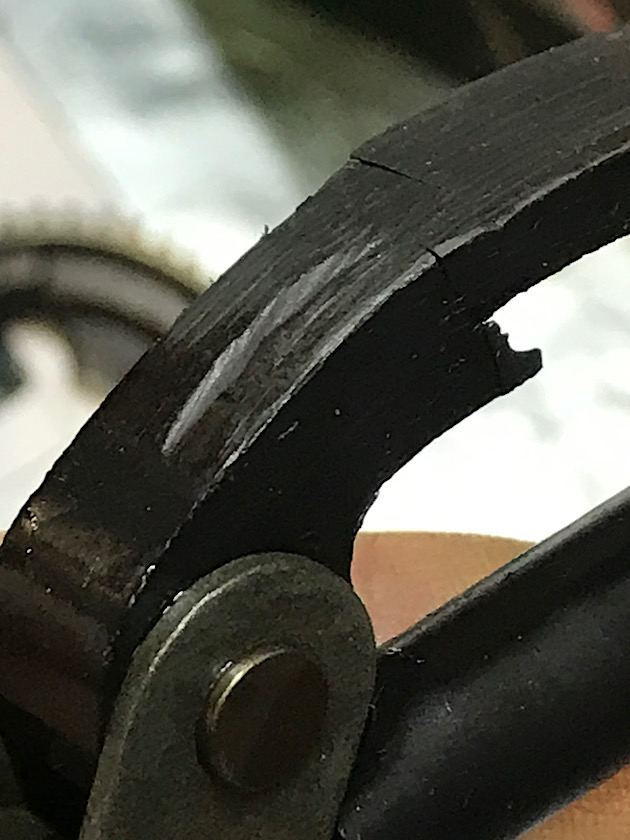 Non sembra molto consumata ma uno dei due perni dì appoggio è rovinato. Sembra essere un pezzo costano sto: plastica iniettata su un’anima Metallica. Forse un termoindurente.